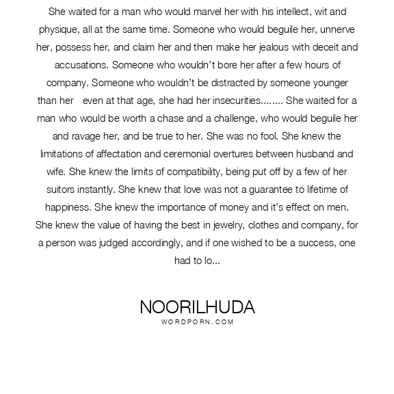 She waited for a man who would marvel her with his intellect, wit and physique, all at the same time. Someone who would beguile her, unnerve her, possess her, and claim her and then make her jealous with deceit and accusations. Someone who wouldn’t bore her after a few hours of company. Someone who wouldn’t be distracted by someone younger than her - even at that age, she had her insecurities........ She waited for a man who would be worth a chase and a challenge, who would beguile her and ravage her, and be true to her. She was no fool. She knew the limitations of affectation and ceremonial overtures between husband and wife. She knew the limits of compatibility, being put off by a few of her suitors instantly. She knew that love was not a guarantee to lifetime of happiness. She knew the importance of money and it’s effect on men. She knew the value of having the best in jewelry, clothes and company, for a person was judged accordingly, and if one wished to be a success, one had to look the part. And that required continuity of resources, not affection. But still she waited. She waited for a man who would surprise her beyond her expectations. She waited for a man who would be magical. She waited for a man who would never come