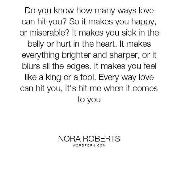Do you know how many ways love can hit you? So it makes you happy, or miserable? It makes you sick in the belly or hurt in the heart. It makes everything brighter and sharper, or it blurs all the edges. It makes you feel like a king or a fool. Every way love can hit you, it's hit me when it comes to you