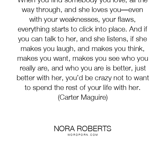 When you find somebody you love, all the way through, and she loves you—even with your weaknesses, your flaws, everything starts to click into place. And if you can talk to her, and she listens, if she makes you laugh, and makes you think, makes you want, makes you see who you really are, and who you are is better, just better with her, you’d be crazy not to want to spend the rest of your life with her. (Carter Maguire)