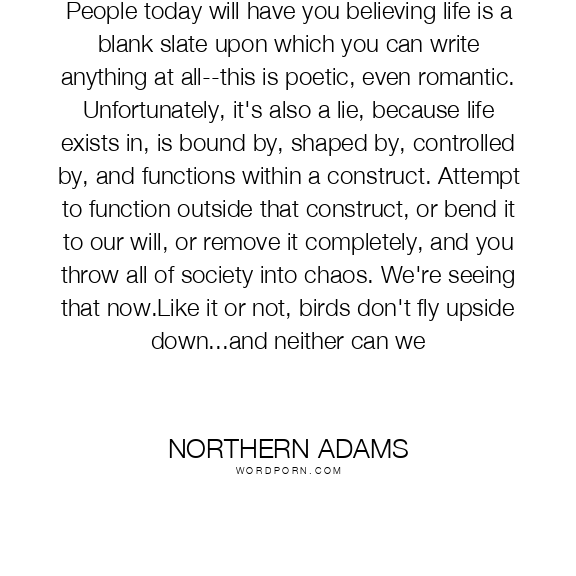 People today will have you believing life is a blank slate upon which you can write anything at all--this is poetic, even romantic. Unfortunately, it's also a lie, because life exists in, is bound by, shaped by, controlled by, and functions within a construct. Attempt to function outside that construct, or bend it to our will, or remove it completely, and you throw all of society into chaos. We're seeing that now.Like it or not, birds don't fly upside down...and neither can we