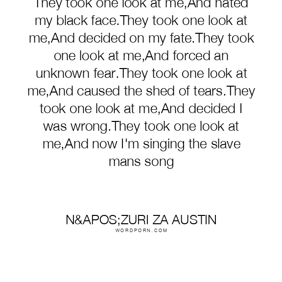 They took one look at me,And hated my black face.They took one look at me,And decided on my fate.They took one look at me,And forced an unknown fear.They took one look at me,And caused the shed of tears.They took one look at me,And decided I was wrong.They took one look at me,And now I'm singing the slave mans song