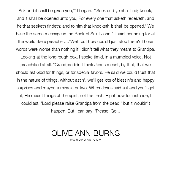 Ask and it shall be given you,'" I began. "'Seek and ye shall find; knock, and it shall be opened unto you; For every one that asketh receiveth; and he that seeketh findeth; and to him that knocketh it shall be opened.' We have the same message in the Book of Saint John," I said, sounding for all the world like a preacher...."Well, but how could I just stop there? Those words were worse than nothing if I didn't tell what they meant to Grandpa. Looking at the long rough box, I spoke timid, in a mumbled voice. Not preachified at all. "Grandpa didn't think Jesus meant, by that, that we should ast God for things, or for special favors. He said we could trust that in the nature of things, without astin', we'll get lots of blessin's and happy surprises and maybe a miracle or two. When Jesus said ast and you'll get it, He meant things of the spirit, not the flesh. Right now for instance, I could ast, 'Lord please raise Grandpa from the dead,' but it wouldn't happen. But I can say, 'Please, God, comfort me,' and I'll get heart's ease. Grandpa said Jesus meant us to ast for hope, forgiveness, and all that. Ast, 'Hep us not be scared, hep us not be greedy, give us courage to try." I was really carried away. "Ast any such and God will give it to you. But don't ast Him not to let fire burn, or say spare me from death. At least, uh, that's what Grandpa said