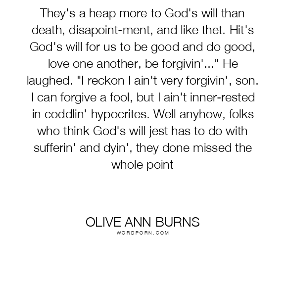 They's a heap more to God's will than death, disapoint-ment, and like thet. Hit's God's will for us to be good and do good, love one another, be forgivin'..." He laughed. "I reckon I ain't very forgivin', son. I can forgive a fool, but I ain't inner-rested in coddlin' hypocrites. Well anyhow, folks who think God's will jest has to do with sufferin' and dyin', they done missed the whole point