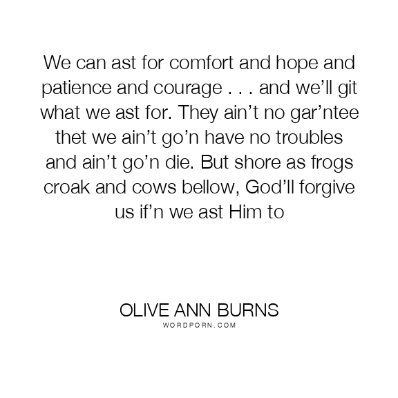 We can ast for comfort and hope and patience and courage . . . and we’ll git what we ast for. They ain’t no gar’ntee thet we ain’t go’n have no troubles and ain’t go’n die. But shore as frogs croak and cows bellow, God’ll forgive us if’n we ast Him to