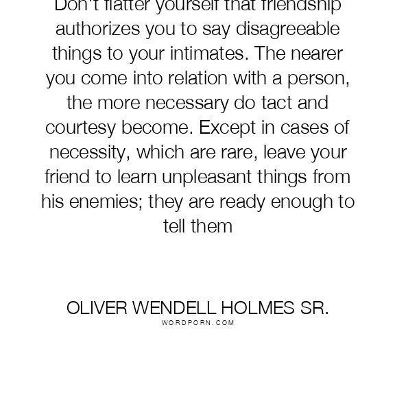 Don't flatter yourself that friendship authorizes you to say disagreeable things to your intimates. The nearer you come into relation with a person, the more necessary do tact and courtesy become. Except in cases of necessity, which are rare, leave your friend to learn unpleasant things from his enemies; they are ready enough to tell them