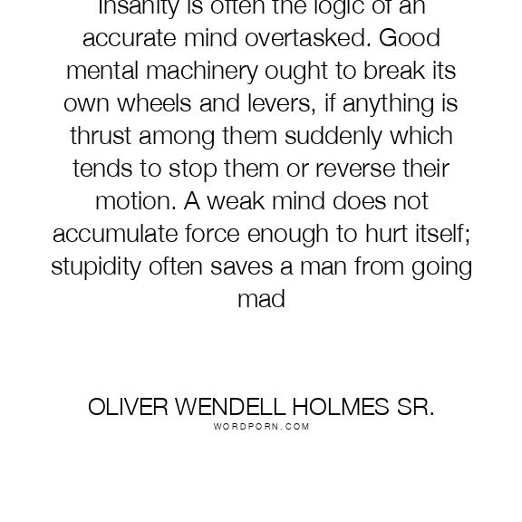 Insanity is often the logic of an accurate mind overtasked. Good mental machinery ought to break its own wheels and levers, if anything is thrust among them suddenly which tends to stop them or reverse their motion. A weak mind does not accumulate force enough to hurt itself; stupidity often saves a man from going mad