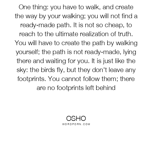 One thing: you have to walk, and create the way by your walking; you will not find a ready-made path. It is not so cheap, to reach to the ultimate realization of truth. You will have to create the path by walking yourself; the path is not ready-made, lying there and waiting for you. It is just like the sky: the birds fly, but they don't leave any footprints. You cannot follow them; there are no footprints left behind