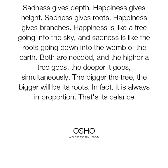 Sadness gives depth. Happiness gives height. Sadness gives roots. Happiness gives branches. Happiness is like a tree going into the sky, and sadness is like the roots going down into the womb of the earth. Both are needed, and the higher a tree goes, the deeper it goes, simultaneously. The bigger the tree, the bigger will be its roots. In fact, it is always in proportion. That's its balance