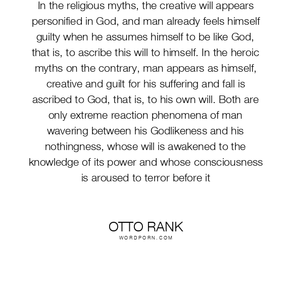 In the religious myths, the creative will appears personified in God, and man already feels himself guilty when he assumes himself to be like God, that is, to ascribe this will to himself. In the heroic myths on the contrary, man appears as himself, creative and guilt for his suffering and fall is ascribed to God, that is, to his own will. Both are only extreme reaction phenomena of man wavering between his Godlikeness and his nothingness, whose will is awakened to the knowledge of its power and whose consciousness is aroused to terror before it