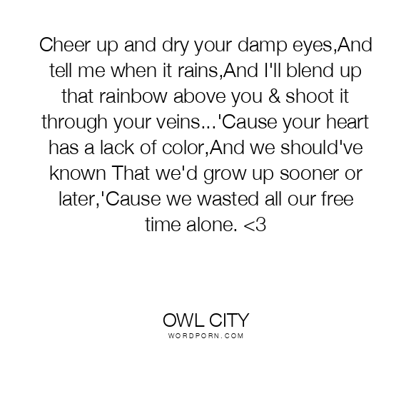Cheer up and dry your damp eyes,And tell me when it rains,And I'll blend up that rainbow above you & shoot it through your veins...'Cause your heart has a lack of color,And we should've known That we'd grow up sooner or later,'Cause we wasted all our free time alone. <3
