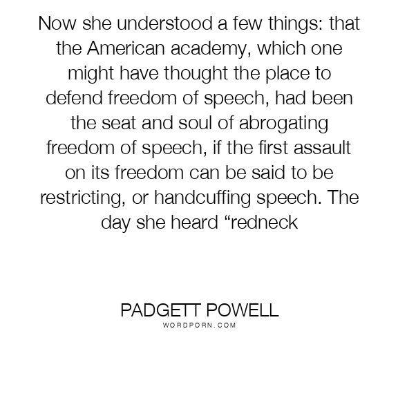 Now she understood a few things: that the American academy, which one might have thought the place to defend freedom of speech, had been the seat and soul of abrogating freedom of speech, if the first assault on its freedom can be said to be restricting, or handcuffing speech. The day she heard “redneck