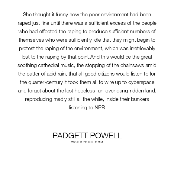 She thought it funny how the poor environment had been raped just fine until there was a sufficient excess of the people who had effected the raping to produce sufficient numbers of themselves who were sufficiently idle that they might begin to protest the raping of the environment, which was irretrievably lost to the raping by that point.And this would be the great soothing cathedral music, the stopping of the chainsaws amid the patter of acid rain, that all good citizens would listen to for the quarter-century it took them all to wire up to cyberspace and forget about the lost hopeless run-over gang-ridden land, reproducing madly still all the while, inside their bunkers listening to NPR