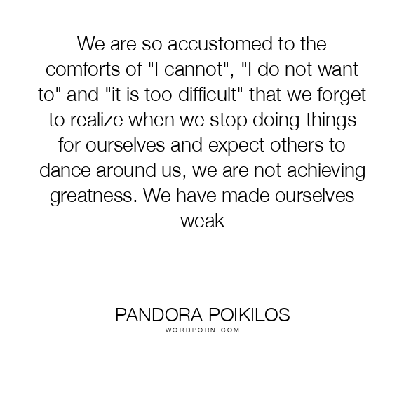 We are so accustomed to the comforts of "I cannot", "I do not want to" and "it is too difficult" that we forget to realize when we stop doing things for ourselves and expect others to dance around us, we are not achieving greatness. We have made ourselves weak