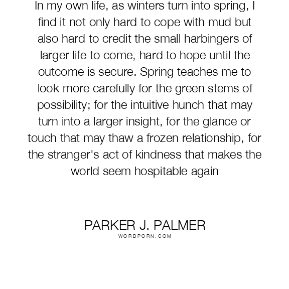 In my own life, as winters turn into spring, I find it not only hard to cope with mud but also hard to credit the small harbingers of larger life to come, hard to hope until the outcome is secure. Spring teaches me to look more carefully for the green stems of possibility; for the intuitive hunch that may turn into a larger insight, for the glance or touch that may thaw a frozen relationship, for the stranger's act of kindness that makes the world seem hospitable again