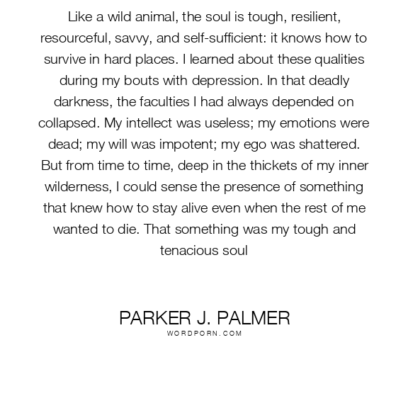 Like a wild animal, the soul is tough, resilient, resourceful, savvy, and self-sufficient: it knows how to survive in hard places. I learned about these qualities during my bouts with depression. In that deadly darkness, the faculties I had always depended on collapsed. My intellect was useless; my emotions were dead; my will was impotent; my ego was shattered. But from time to time, deep in the thickets of my inner wilderness, I could sense the presence of something that knew how to stay alive even when the rest of me wanted to die. That something was my tough and tenacious soul