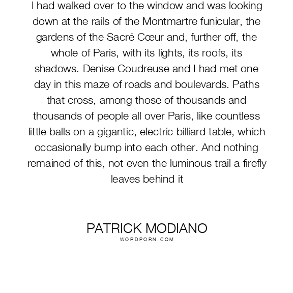 I had walked over to the window and was looking down at the rails of the Montmartre funicular, the gardens of the Sacré Cœur and, further off, the whole of Paris, with its lights, its roofs, its shadows. Denise Coudreuse and I had met one day in this maze of roads and boulevards. Paths that cross, among those of thousands and thousands of people all over Paris, like countless little balls on a gigantic, electric billiard table, which occasionally bump into each other. And nothing remained of this, not even the luminous trail a firefly leaves behind it