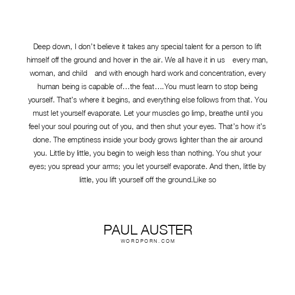 Deep down, I don’t believe it takes any special talent for a person to lift himself off the ground and hover in the air. We all have it in us—every man, woman, and child—and with enough hard work and concentration, every human being is capable of…the feat….You must learn to stop being yourself. That’s where it begins, and everything else follows from that. You must let yourself evaporate. Let your muscles go limp, breathe until you feel your soul pouring out of you, and then shut your eyes. That’s how it’s done. The emptiness inside your body grows lighter than the air around you. Little by little, you begin to weigh less than nothing. You shut your eyes; you spread your arms; you let yourself evaporate. And then, little by little, you lift yourself off the ground.Like so