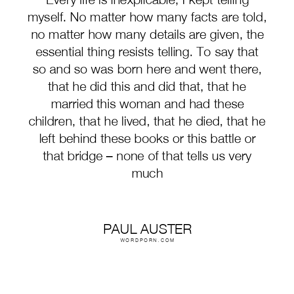 Every life is inexplicable, I kept telling myself. No matter how many facts are told, no matter how many details are given, the essential thing resists telling. To say that so and so was born here and went there, that he did this and did that, that he married this woman and had these children, that he lived, that he died, that he left behind these books or this battle or that bridge – none of that tells us very much
