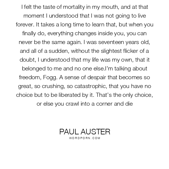 I felt the taste of mortality in my mouth, and at that moment I understood that I was not going to live forever. It takes a long time to learn that, but when you finally do, everything changes inside you, you can never be the same again. I was seventeen years old, and all of a sudden, without the slightest flicker of a doubt, I understood that my life was my own, that it belonged to me and no one else.I’m talking about freedom, Fogg. A sense of despair that becomes so great, so crushing, so catastrophic, that you have no choice but to be liberated by it. That’s the only choice, or else you crawl into a corner and die