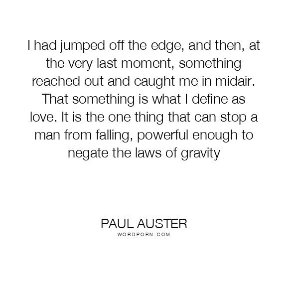 I had jumped off the edge, and then, at the very last moment, something reached out and caught me in midair. That something is what I define as love. It is the one thing that can stop a man from falling, powerful enough to negate the laws of gravity