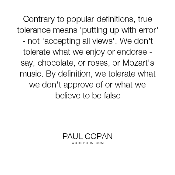Contrary to popular definitions, true tolerance means 'putting up with error' - not 'accepting all views'. We don't tolerate what we enjoy or endorse - say, chocolate, or roses, or Mozart's music. By definition, we tolerate what we don't approve of or what we believe to be false