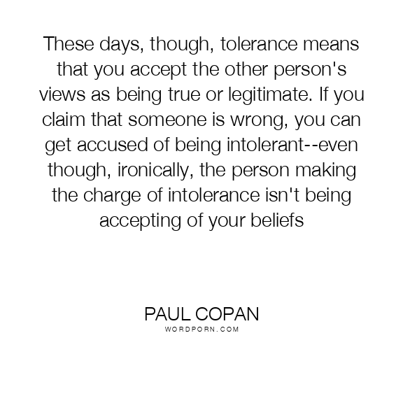 These days, though, tolerance means that you accept the other person's views as being true or legitimate. If you claim that someone is wrong, you can get accused of being intolerant--even though, ironically, the person making the charge of intolerance isn't being accepting of your beliefs