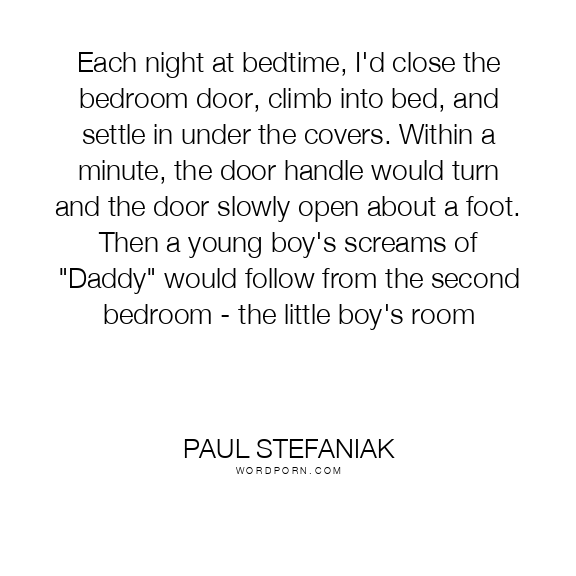 Each night at bedtime, I'd close the bedroom door, climb into bed, and settle in under the covers. Within a minute, the door handle would turn and the door slowly open about a foot. Then a young boy's screams of "Daddy" would follow from the second bedroom - the little boy's room