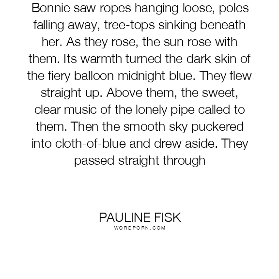 Bonnie saw ropes hanging loose, poles falling away, tree-tops sinking beneath her. As they rose, the sun rose with them. Its warmth turned the dark skin of the fiery balloon midnight blue. They flew straight up. Above them, the sweet, clear music of the lonely pipe called to them. Then the smooth sky puckered into cloth-of-blue and drew aside. They passed straight through