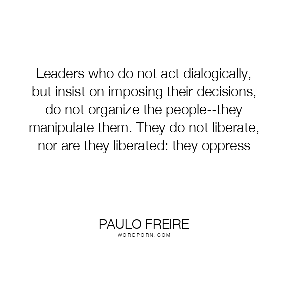 Leaders who do not act dialogically, but insist on imposing their decisions, do not organize the people--they manipulate them. They do not liberate, nor are they liberated: they oppress