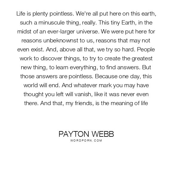 Life is plenty pointless. We're all put here on this earth, such a minuscule thing, really. This tiny Earth, in the midst of an ever-larger universe. We were put here for reasons unbeknownst to us, reasons that may not even exist. And, above all that, we try so hard. People work to discover things, to try to create the greatest new thing, to learn everything, to find answers. But those answers are pointless. Because one day, this world will end. And whatever mark you may have thought you left will vanish, like it was never even there. And that, my friends, is the meaning of life