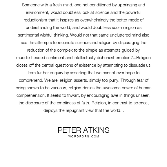 Someone with a fresh mind, one not conditioned by upbringing and environment, would doubtless look at science and the powerful reductionism that it inspires as overwhelmingly the better mode of understanding the world, and would doubtless scorn religion as sentimental wishful thinking. Would not that same uncluttered mind also see the attempts to reconcile science and religion by disparaging the reduction of the complex to the simple as attempts guided by muddle-headed sentiment and intellectually dishonest emotion?...Religion closes off the central questions of existence by attempting to dissuade us from further enquiry by asserting that we cannot ever hope to comprehend. We are, religion asserts, simply too puny. Through fear of being shown to be vacuous, religion denies the awesome power of human comprehension. It seeks to thwart, by encouraging awe in things unseen, the disclosure of the emptiness of faith. Religion, in contrast to science, deploys the repugnant view that the world is too big for our understanding. Science, in contrast to religion, opens up the great questions of being to rational discussion, to discussion with the prospect of resolution and elucidation. Science, above all, respects the power of the human intellect. Science is the apotheosis of the intellect and the consummation of the Renaissance. Science respects more deeply the potential of humanity than religion ever can