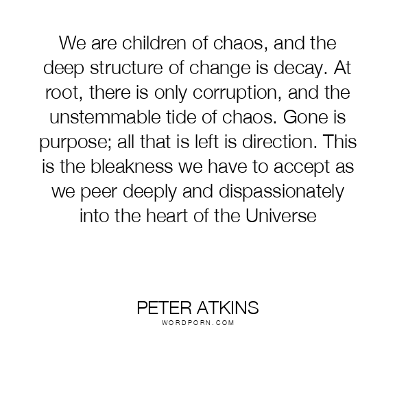 We are children of chaos, and the deep structure of change is decay. At root, there is only corruption, and the unstemmable tide of chaos. Gone is purpose; all that is left is direction. This is the bleakness we have to accept as we peer deeply and dispassionately into the heart of the Universe