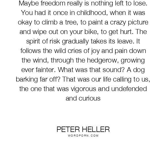 Maybe freedom really is nothing left to lose. You had it once in childhood, when it was okay to climb a tree, to paint a crazy picture and wipe out on your bike, to get hurt. The spirit of risk gradually takes its leave. It follows the wild cries of joy and pain down the wind, through the hedgerow, growing ever fainter. What was that sound? A dog barking far off? That was our life calling to us, the one that was vigorous and undefended and curious