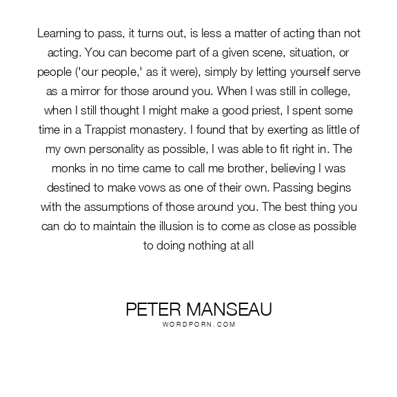 Learning to pass, it turns out, is less a matter of acting than not acting. You can become part of a given scene, situation, or people ('our people,' as it were), simply by letting yourself serve as a mirror for those around you. When I was still in college, when I still thought I might make a good priest, I spent some time in a Trappist monastery. I found that by exerting as little of my own personality as possible, I was able to fit right in. The monks in no time came to call me brother, believing I was destined to make vows as one of their own. Passing begins with the assumptions of those around you. The best thing you can do to maintain the illusion is to come as close as possible to doing nothing at all