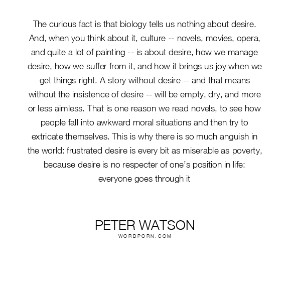 The curious fact is that biology tells us nothing about desire. And, when you think about it, culture -- novels, movies, opera, and quite a lot of painting -- is about desire, how we manage desire, how we suffer from it, and how it brings us joy when we get things right. A story without desire -- and that means without the insistence of desire -- will be empty, dry, and more or less aimless. That is one reason we read novels, to see how people fall into awkward moral situations and then try to extricate themselves. This is why there is so much anguish in the world: frustrated desire is every bit as miserable as poverty, because desire is no respecter of one’s position in life: everyone goes through it