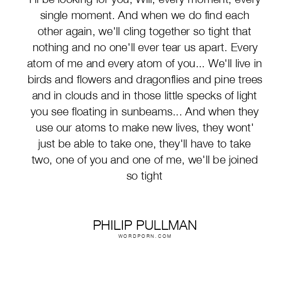 I'll be looking for you, Will, every moment, every single moment. And when we do find each other again, we'll cling together so tight that nothing and no one'll ever tear us apart. Every atom of me and every atom of you... We'll live in birds and flowers and dragonflies and pine trees and in clouds and in those little specks of light you see floating in sunbeams... And when they use our atoms to make new lives, they wont' just be able to take one, they'll have to take two, one of you and one of me, we'll be joined so tight