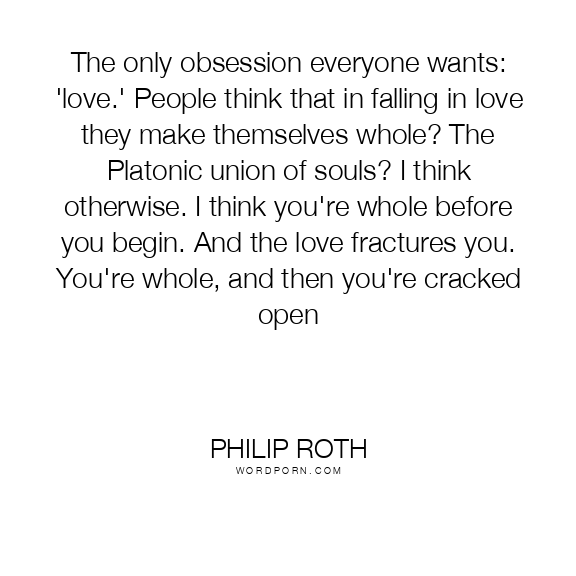 The only obsession everyone wants: 'love.' People think that in falling in love they make themselves whole? The Platonic union of souls? I think otherwise. I think you're whole before you begin. And the love fractures you. You're whole, and then you're cracked open