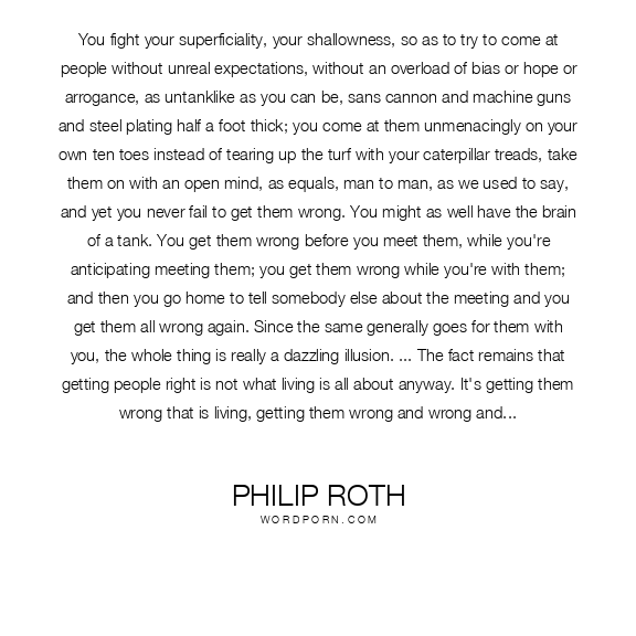 You fight your superficiality, your shallowness, so as to try to come at people without unreal expectations, without an overload of bias or hope or arrogance, as untanklike as you can be, sans cannon and machine guns and steel plating half a foot thick; you come at them unmenacingly on your own ten toes instead of tearing up the turf with your caterpillar treads, take them on with an open mind, as equals, man to man, as we used to say, and yet you never fail to get them wrong. You might as well have the brain of a tank. You get them wrong before you meet them, while you're anticipating meeting them; you get them wrong while you're with them; and then you go home to tell somebody else about the meeting and you get them all wrong again. Since the same generally goes for them with you, the whole thing is really a dazzling illusion. ... The fact remains that getting people right is not what living is all about anyway. It's getting them wrong that is living, getting them wrong and wrong and wrong and then, on careful reconsideration, getting them wrong again. That's how we know we're alive: we're wrong. Maybe the best thing would be to forget being right or wrong about people and just go along for the ride. But if you can do that -- well, lucky you