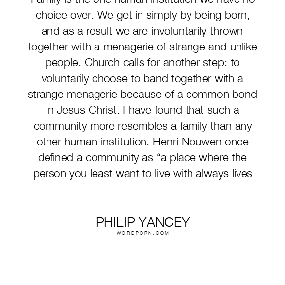 Family is the one human institution we have no choice over. We get in simply by being born, and as a result we are involuntarily thrown together with a menagerie of strange and unlike people. Church calls for another step: to voluntarily choose to band together with a strange menagerie because of a common bond in Jesus Christ. I have found that such a community more resembles a family than any other human institution. Henri Nouwen once defined a community as “a place where the person you least want to live with always lives