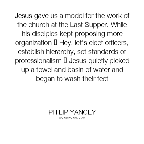 Jesus gave us a model for the work of the church at the Last Supper. While his disciples kept proposing more organization ─ Hey, let's elect officers, establish hierarchy, set standards of professionalism ─ Jesus quietly picked up a towel and basin of water and began to wash their feet
