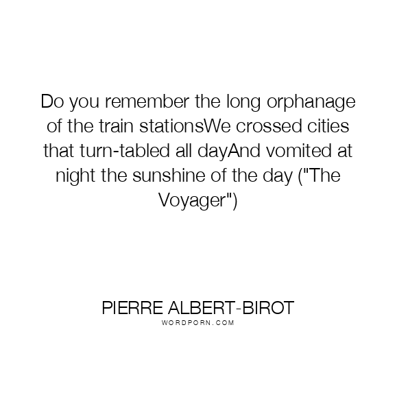 Do you remember the long orphanage of the train stationsWe crossed cities that turn-tabled all dayAnd vomited at night the sunshine of the day ("The Voyager")