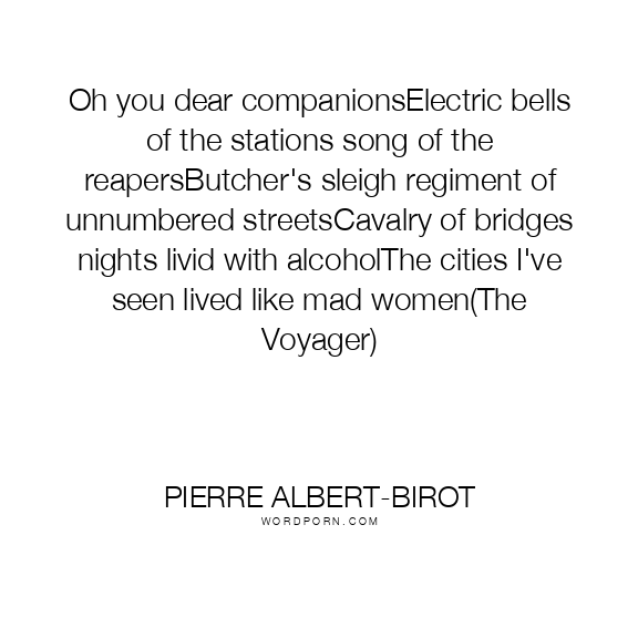 Oh you dear companionsElectric bells of the stations song of the reapersButcher's sleigh regiment of unnumbered streetsCavalry of bridges nights livid with alcoholThe cities I've seen lived like mad women(The Voyager)