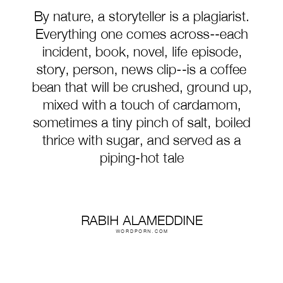 By nature, a storyteller is a plagiarist. Everything one comes across--each incident, book, novel, life episode, story, person, news clip--is a coffee bean that will be crushed, ground up, mixed with a touch of cardamom, sometimes a tiny pinch of salt, boiled thrice with sugar, and served as a piping-hot tale