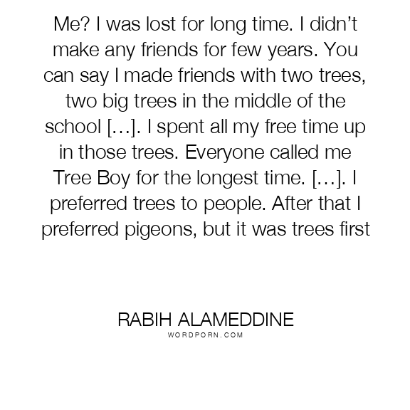 Me? I was lost for long time. I didn’t make any friends for few years. You can say I made friends with two trees, two big trees in the middle of the school […]. I spent all my free time up in those trees. Everyone called me Tree Boy for the longest time. […]. I preferred trees to people. After that I preferred pigeons, but it was trees first