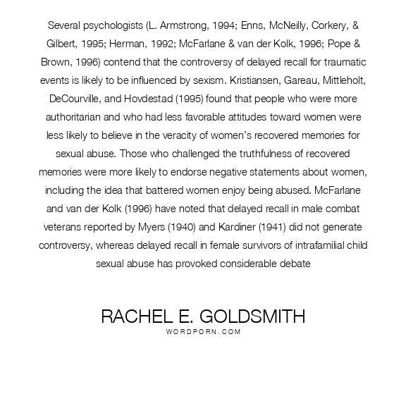 Several psychologists (L. Armstrong, 1994; Enns, McNeilly, Corkery, & Gilbert, 1995; Herman, 1992; McFarlane & van der Kolk, 1996; Pope & Brown, 1996) contend that the controversy of delayed recall for traumatic events is likely to be influenced by sexism. Kristiansen, Gareau, Mittleholt, DeCourville, and Hovdestad (1995) found that people who were more authoritarian and who had less favorable attitudes toward women were less likely to believe in the veracity of women’s recovered memories for sexual abuse. Those who challenged the truthfulness of recovered memories were more likely to endorse negative statements about women, including the idea that battered women enjoy being abused. McFarlane and van der Kolk (1996) have noted that delayed recall in male combat veterans reported by Myers (1940) and Kardiner (1941) did not generate controversy, whereas delayed recall in female survivors of intrafamilial child sexual abuse has provoked considerable debate