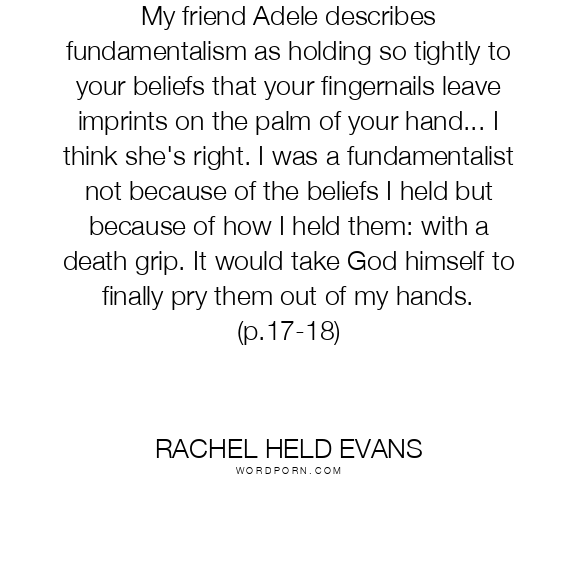 My friend Adele describes fundamentalism as holding so tightly to your beliefs that your fingernails leave imprints on the palm of your hand... I think she's right. I was a fundamentalist not because of the beliefs I held but because of how I held them: with a death grip. It would take God himself to finally pry them out of my hands. (p.17-18)