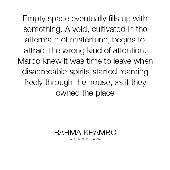 Empty space eventually fills up with something. A void, cultivated in the aftermath of misfortune, begins to attract the wrong kind of attention. Marco knew it was time to leave when disagreeable spirits started roaming freely through the house, as if they owned the place