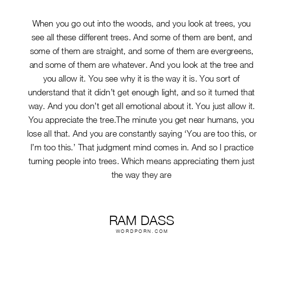 When you go out into the woods, and you look at trees, you see all these different trees. And some of them are bent, and some of them are straight, and some of them are evergreens, and some of them are whatever. And you look at the tree and you allow it. You see why it is the way it is. You sort of understand that it didn’t get enough light, and so it turned that way. And you don’t get all emotional about it. You just allow it. You appreciate the tree.The minute you get near humans, you lose all that. And you are constantly saying ‘You are too this, or I’m too this.’ That judgment mind comes in. And so I practice turning people into trees. Which means appreciating them just the way they are