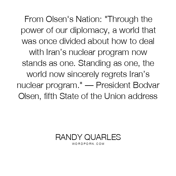 From Olsen's Nation: "Through the power of our diplomacy, a world that was once divided about how to deal with Iran’s nuclear program now stands as one. Standing as one, the world now sincerely regrets Iran’s nuclear program." — President Bodvar Olsen, fifth State of the Union address