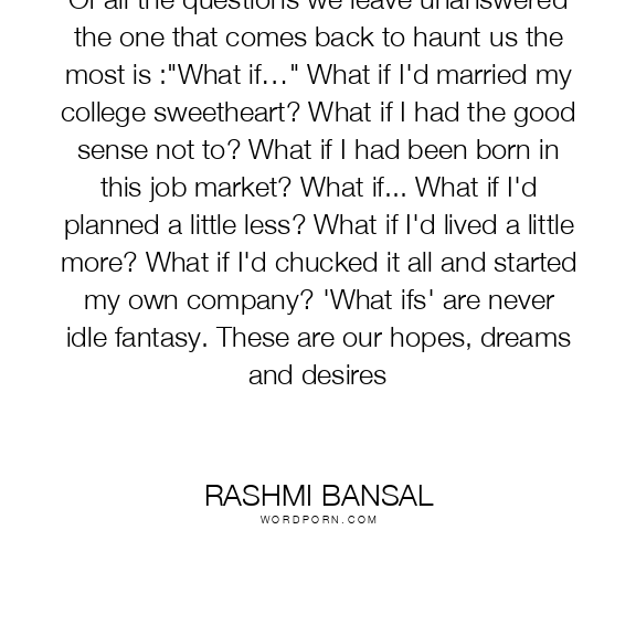 Of all the questions we leave unanswered the one that comes back to haunt us the most is :"What if…" What if I'd married my college sweetheart? What if I had the good sense not to? What if I had been born in this job market? What if... What if I'd planned a little less? What if I'd lived a little more? What if I'd chucked it all and started my own company? 'What ifs' are never idle fantasy. These are our hopes, dreams and desires